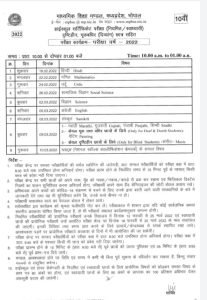 माध्यमिक शिक्षा मंडल ने वर्ष 2022 की कक्षा 10वीं, 12वीं, 12वीं व्यावसायिक पाठ्यक्रम परीक्षा/ शारीरिक शिक्षा प्रशिक्षण और विद्यालय पूर्व शिक्षा में डिप्लोमा (डी.पी.एस.ई.) के परीक्षा कार्यक्रम घोषित कर दिए हैं। कार्यक्रम अनुसार प्रदेश में 10वीं बोर्ड की परीक्षा 18 फरवरी से 10 मार्च और कक्षा 12वीं बोर्ड की परीक्षा 17 फरवरी से 12 मार्च की अवधि में होगी। सभी परीक्षाएँ सुबह 10 बजे से दोपहर 1 बजे के बीच होगी। कक्षा 10वीं और 12वीं के नियमित छात्रों की प्रायोगिक परीक्षाएँ उनके विद्यालय में 12 फरवरी से 25 मार्च 2022 के बीच और स्वाध्यायी छात्रों की उन्हें आवंटित परीक्षा केंद्र पर 17 फरवरी से 20 मार्च 2022 के बीच होगी। परीक्षा कार्यक्रम मंडल की वेबसाइट www.mpbse.nic.in पर भी देखे जा सकते हैं।