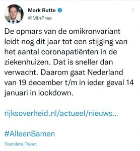 मीडिया से बात करते हुए नीदरलैंड के प्रधानमंत्री मार्क रुट ने कहा कि ‘मुझे ये बताते हुए दुख हो रहा है कि नीदरलैंड में फिर से लॉकडाउन लगने वाला है।’ नीदरलैंड सरकार ने ये फैसला देश में कोरोना वायरस के ओमिक्रॉन वैरिएंट के बढ़ते मामलों को देखते हुए लिया है।