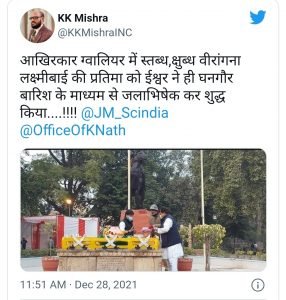 केंद्रीय मंत्री ज्योतिरादित्य सिंधिया द्वारा रानी लक्ष्मीबाई समाधिस्थल पर पहुंचने के बाद प्रदेश में लगातार सियासत जारी है। इस मामले में कांग्रेस ने केंद्रीय मंत्री ज्योतिरादित्य सिंधिया पर जुबानी हमला तेज कर दिया है। कांग्रेस ने कहा है कि वीरांगना की आत्मा को दुख पहुंचा है। वहीं मध्य प्रदेश कांग्रेस प्रवक्ता केके मिश्रा ने ट्वीट कर कहा है कि आखिरकार ग्वालियर में स्तब्ध, क्षुब्ध वीरांगना लक्ष्मीबाई की प्रतिमा को ईश्वर ने ही घनघोर बारिश से जलाभिषेक कर शुद्ध कर दिया। इस बीच मंगलवार को कांग्रेस नेता सिद्धार्थ सिंह तेजावत ने लक्ष्मीबाई की समाधि पर फूल चढ़ाए। वह समाधि पर गंगाजल भी चढ़ाना चाहते थे, लेकिन पुलिस ने उन्हें गिरफ्तार कर लिया।