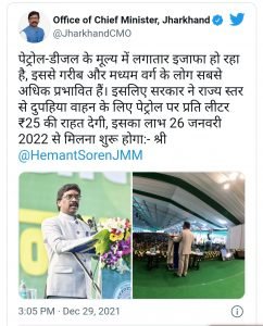 ”पेट्रोल-डीजल के मूल्य में लगातार इजाफा हो रहा है, इससे गरीब और मध्यम वर्ग के लोग सबसे अधिक प्रभावित हैं। इसलिए सरकार ने राज्य स्तर से दुपहिया वाहन के लिए पेट्रोल पर प्रति लीटर ₹25 की राहत देगी, इसका लाभ 26 जनवरी 2022 से मिलना शुरू होगा।” सरकार की ओर से बताया गया कि यदि कोई राशन कार्डधारी अगर अपनी गाड़ी में पेट्रोल भराता है तो झारखंड सरकार प्रति महीने 10 लीटर तक के पेट्रोल पर 25 रुपए प्रति लीटर यानी 250 रुपए उनके अकाउंट में कैश ट्रांसफर करेगी। कुल मिलाकर गरीबों को स्कूटर/बाइक में पेट्रोल भराने पर प्रति महीने अधिकतम 250 रुपए का लाभ मिलेगा।