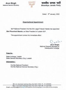 भाजपा ने रविवार को लद्दाख और लक्षद्वीप के लिए नया प्रदेश अध्यक्ष नियुक्त किया। फुनचोक स्टेनजिन और के.एन. कास्मिकोया को क्रमश: लद्दाख और लक्षद्वीप का प्रदेश अध्यक्ष नियुक्त किया गया है। भाजपा के राष्ट्रीय महासचिव अरुंड सिंह द्वारा हस्ताक्षरित एक पत्र में कहा गया है, भाजपा के राष्ट्रीय अध्यक्ष जगत प्रकाश नड्डा ने फुनचोक स्टेनजिन को लद्दाख भाजपा का प्रदेश अध्यक्ष नियुक्त किया है। यह नियुक्ति तत्काल प्रभाव से लागू होती है।