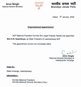 महासचिव अरुण सिंह द्वारा जारी एक पत्र में कहा गया है, ‘बीजेपी के राष्ट्रीय अध्यक्ष जगत प्रकाश नड्डा ने फुंचोक स्टेनज़िन को लद्दाख बीजेपी के प्रदेश अध्यक्ष के रूप में नियुक्त किया है । यह नियुक्ति तत्काल प्रभाव से लागू हो गई है.’ वहीं, एक अन्य पत्र में उन्होंने कहा कि केएन कास्मिकोया को लक्षद्वीप बीजेपी का नया प्रदेश अध्यक्ष चुना गया है ।
