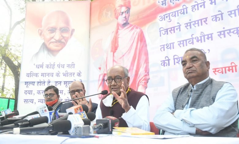पूर्व मुख्यमंत्री दिग्विजय सिंह ने आज पत्रकार वार्ता में कहा कि मैं उस परिवार से आता हूं जो बहुत धार्मिक प्रवत्ति का है। मेरी माँ बहुत ही धार्मिक थी और जिस समय दलितों का मंदिरों में प्रवेश वर्जित था तब 1941 में मेरे पिता ने दलितों के लिए मंदिर में प्रवेश दिलवाया था। दिग्विजय सिंह जी ने आरएसएस पर हमला करते हुए कहा कि सावरकर ने हिंदुत्व शब्द का इस्तेमाल राजनीति के लिए किया था जबकि हिन्दू का हिंदुत्व शब्द से कोई लेना देना नही है और न ही हमारे किसी धार्मिक ग्रन्थों में हिंदुत्व शब्द का इस्तेमाल किया गया। उन्होंने स्प्ष्ट शब्दों में कहा की मैंने जिंदगी में कभी भी भगवा आतंकवाद शब्द का प्रयोग नही किया, मैं हमेशा संघी आतंकवाद कहता हूं।