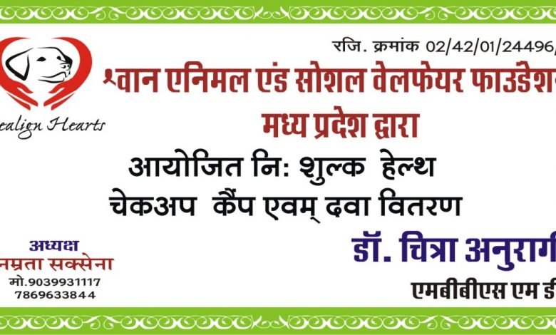 श्वान एनिमल एंड सोशल वेलफेयर फाउंडेशन द्वारा 26 को निःशुल्क हेल्थ चेक उप शिविर