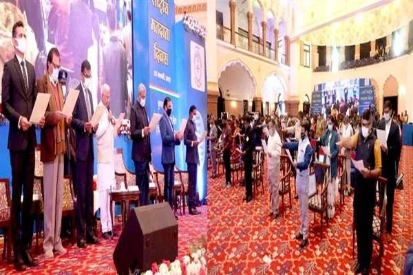 राज्यपाल श्री पटेल ने मतदाता दिवस पर नव मतदाताओं को इपिक कार्ड प्रदान किए। “मतदान की अनिवार्यता” पर आयोजित निबंध प्रतियोगिताओं के विजेताओं को पुरस्कृत किया। फोटो निर्वाचक नामावली के संक्षिप्त पुनरीक्षण, सर्वाधिक पंजीकरण, जेंडर अनुपात में वृद्धि, नवीन मतदाता जोड़ने आदि उत्कृष्ट कार्यों के लिए जिला स्तरीय और मुख्य निर्वाचन पदाधिकारी कार्यालय में पदस्थ अधिकारी, कर्मचारियों को भी प्रशस्ति-पत्र से सम्मानित किया गया।