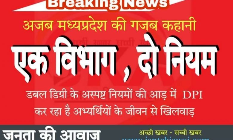 मध्यप्रदेश में हमेशा ही अजब और गजब कार्य होते हैं । यहाँ के सरकारी विभागों को अक्सर विवादों में देखा जा सकता है और इतना ही खुद के बनाए नियमों की धज्जियां उड़ाते हुए इन्हें तनिक भी संकोच नहीं होता है । एक विभाग में दो – दो नियम बनाकर अभ्यर्थियों के भविष्य के साथ खिलवाड़ करने की फितरत अब मध्यप्रदेश लोक शिक्षण संचालनालय की बन गई है । जानकारी के मुताबिक लोक शिक्षण संचालनालय की खामी को भुगत रहे, डबल डिग्री नाम की भयंकर समस्या से पीड़ित अभ्यर्थी जब राज्य के स्कूल शिक्षा मंत्री माननीय इंदर सिंह परमार से मिले तो मंत्री जी ने साफ कहा था की एक रेगुलर और एक प्राइवेट डिग्री बालों को मान्य किया जाएगा, लेकिन DPI के जिम्मेदार अधिकारी उड़ा रहे हैं मंत्री जी के आश्वासन की धज्जियाँ उड़ा रहे हैं और लगातार एक रेगुलर और एक प्राइवेट डिग्री वाले पात्र अभ्यर्थियों का शोषण कर रहे हैं।