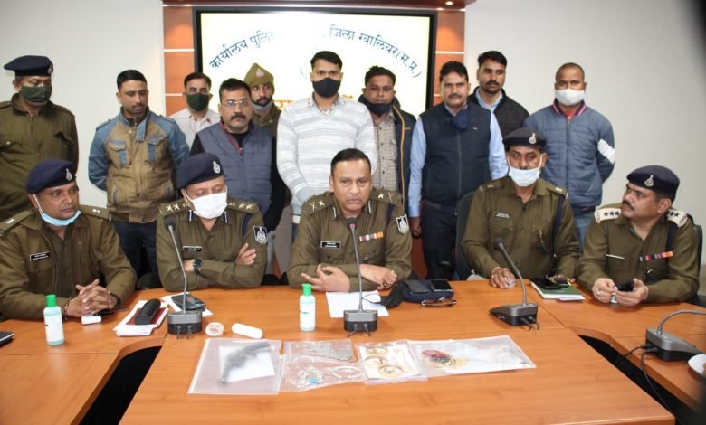 ग्वालियर. ( आकाश कुशवाहा ) :प्रेमनगर में 23 जनवरी की रात 8.30 बजे अज्ञात लूटेरों द्वारा सराफा कारोबारी शैलेन्द्र गोयल से 300 ग्राम सोने की ज्वेलरी से भरा बैग 5 अज्ञात आरोपियों लूट कर गये थे। इस पर एसपी अमित सांघी द्वारा लुटेरों 10 हजार रूपये का इनाम घोषित किया गया था इसके बाद आईजी ग्वालियर अनिल शर्मा द्वारा 25-25 हजार रूपये का इनाम घोषित किया गया था। इन लुटेरों को पकड़ने में एएसपी सत्येन्द्रसिंह तोमर, राजेश दण्डोतिया, सीएसपी विजय भदौरिया, नागेन्द्रसिंह सिकरबार, डीएसपी रत्नेश तोमर, टीआई पड़ाव अष्ठाना, टीआई क्राइम ब्रांच दामोदर गुप्ता को लगाया था।