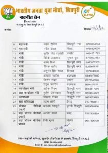 भारतीय जनता पार्टी युवा मोर्चा शिवपुरी के जिला अध्यक्ष नवनीत सेन ने भाजपा युवा मोर्चा के प्रदेश अध्यक्ष वैभव पवार और पार्टी के जिला अध्यक्ष राजू बाथम की अनुशंसा पर आज अपनी जिला कार्यकारिणी की घोषणा की है । युवा मोर्चा जिला अध्यक्ष नवनीत सेन ने जिला कार्यकारिणी में मनीष बंसल उर्फ रामू भैया बैराड़ को जिला महामंत्री नियुक्त किया है । नवीन कार्यकारिणी में 8 उपाध्यक्ष , 2 महामंत्री , 8 मंत्री , 1-1 कार्यालय मंत्री , सह कार्यालय मंत्री, कोषाध्यक्ष ,सह कोषाध्यक्ष ,सोशल मीडिया प्रभारी और मीडिया प्रभारी के अलावा 3 सह सोशल मीडिया प्रभारी एवं 2 मीडिया प्रभारियों की नियुक्ति की है ।