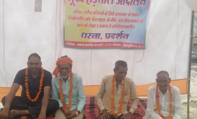 कैलारस – वर्तमान में नगर कैलारस के अंतर्गत नेरोगैज से ब्रॉडगेज निर्माण का कार्य द्रुत गति से जारी है। इसके लिए दोनों ओर ऊंची दीवार बनाई जा रही है। जिसमें अस्पताल जाने के लिए वार्ड 1, 2 ,3, 6 ,7 के लिए कोई रास्ता नहीं रखा गया है। इससे लगभग 10, हजार की आबादी के लिए अस्पताल जाने का रास्ता बंद हो रहा है। परंपरागत रूप से कृष्ण मार्ग के सामने से कृष्ण मार्ग ,कुशवाह मोहल्ला, बाल्मीकि मोहल्ला, रजक मोहल्ला, इस्लाम मार्ग, पुरानी मस्जिद गली आदि सभी बस्तियां अस्पताल के लिए आती जाती हैं। इस संबंध में पूर्व में रेल मंत्री, केंद्रीय कृषि मंत्री श्री नरेंद्र सिंह तोमर, नागरिक उड्डयन मंत्री श्री ज्योतिरादित्य सिंधिया एवं वरिष्ठ अधिकारियों को बस्ती के निवासियों की ओर से ज्ञापन दिए गए हैं। लेकिन कोई सुनवाई नहीं हो रही है। आज दिनांक 3 अगस्त से क्रमिक भूख हड़ताल शुरू की गई है। इस भूख हड़ताल में सर्वश्री विनोद कुमार शाक्य, सूखाराम जाटव, गफूर खान, प्रकाश जाटव आज बैठे हैं। जो कल तक बैठेंगे। उसके बाद भूख हड़ताल यों का दूसरा जत्था बैठेगा। इससे पूर्व 27 जुलाई को स्थानीय तहसीलदार महोदय कैलारस श्री भरत कुमार को ज्ञापन प्रस्तुत कर अस्पताल के लिए रास्ता हेतु अंडर ब्रिज बनाने की मांग को लेकर ज्ञापन दिया गया है।ज्ञापन की प्रतियां कलेक्टर महोदय, एसडीएम महोदय तथा मैनेजर एनसीआर झांसी को भी भेजी गई है। ज्ञापन में मांग की गई थी, कि अस्पताल के लिए उक्त बस्तियों के आवागमन को जारी रखने हेतु कृष्ण मार्ग के सामने अंडर ब्रिज बनाया जाए।