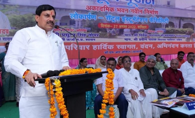 उच्च शिक्षा मंत्री डॉ. मोहन यादव ने यह बात शनिवार को यहाँ शासकीय कमलाराजा कन्या स्नातकोत्तर स्वशासी महाविद्यालय के नवीन अकादमिक भवन के निर्माण एवं उन्नयनीकरण कार्य के भूमिपूजन तथा सेंट्रल इंस्ट्रूमेंटेशन फैसिलिटी कार्य के लोकार्पण के अवसर पर कही। वे कार्यक्रम के मुख्य अतिथ थे तथा मध्यप्रदेश गृह निर्माण एवं अधोसंरचना विकास मण्डल के अध्यक्ष श्री आशुतोष तिवारी ने अध्यक्षता की। इस अवसर पर फार्म एवं बीज विकास निगम के पूर्व अध्यक्ष श्री महेन्द्र सिंह यादव, बीजेपी के जिला महामंत्री श्री हरीश मेवाफरोश, अन्य जनप्रतिनिधि, महाविद्यालय के प्राचार्य डॉ. एम आर कौशल, गृह निर्माण मण्डल के डिप्टी कमिश्नर श्री एस के सुमन, कार्यपरिषद के सदस्य, महाविद्यालय के प्राध्यापक तथा छात्राएँ उपस्थित थीं।