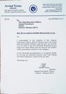 जनपद पंचायत पोहरी के नवनिर्वाचित सदस्य एडवोकेट अरविंद सिंह वर्मा दुल्हारा ने एक अभिनव पहल की है जिसमें उन्होंने मुख्य कार्यपालन अधिकारी को पत्र लिखकर सरकार की ओर से मिलने वाले मानदेय को लेने से इनकार कर दिया है । जानकारी के अनुसार जनपद सदस्य एडवोकेट अरविंद वर्मा ने जनपद पंचायत के मुख्य कार्यपालन अधिकारी को पत्र लिखा है पत्र में उन्होंने कहा है कि “मैं जनपद पंचायत पोहरी जिला शिवपुरी का सदस्य बना हूं और सरकार जो भी प्रतिमाह भुगतान करती है, मुझे मानदेय दिया जा रहा है। मैं उपरोक्त मानदेय को प्राप्त नहीं करना चाहता और उसे सरकारी योजना या ग्रामीणों के कल्याण के लिए इस्तेमाल किया जा सकता है। उपरोक्त परिस्थितियों में, अनुरोध है कि कृपया मुझे उपरोक्त राशि का भुगतान न करें और मैं यह पत्र अपनी ओर से स्वतंत्र सहमति के आधार पर लिख रहा हूं।”