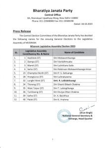 मिजोरम समेत पांच राज्यों में चुनावी बिगुल बज चुका है। चुनाव की तरीकों का ऐलान होते ही सभी राजनैतिक पार्टियों में खलबली मच गई है। सभी पार्टियां चुनाव जीतने के लिए अपनी पूरी ताकत झोंक रही है। एक तरफ जहां सत्ता में काबिज कांग्रेस एक बार फिर से प्रदेश में अपनी सरकार बनाने के लिए जोर दे रही है, तो वहीं दूसरी तरफ भाजपा सत्ता पाने के लिए बेताब है। ऐसे में दोनों ही पार्टियां प्रत्याशियों के चयन में फूंक-फूंककर कदम रख रही है। इसी बीच मिजोरम विधानसभा चुनाव के लिए भारतीय जनता पार्टी ने 12 उम्मीदवारों की लिस्ट जारी की है।