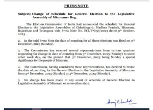 मिजोरम विधानसभा चुनाव के परिणाम अन्य चार राज्यों मध्य प्रदेश, राजस्थान, छत्तीसगढ़ और तेलंगाना के साथ घोषित नहीं होंगे. मिजोरम के लोगों की मांग पर चुनाव आयोग ने चुनाव परिणाम घोषित करने की तारीख तीन दिसंबर से बदलकर 4 दिसंबर को करने का ऐलान किया है. चुनाव आयोग ने कहा कि विभिन्न क्षेत्रों से कई आवेदन मिले थे, क्योकि वहां के लोगों के लिए रविवार का विशेष महत्व है.