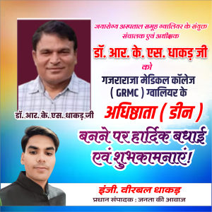ग्वालियर : प्रदेश के सबसे पुराने मेडिकल कॉलेज गजराराजा मेडिकल कॉलेज ग्वालियर एवं जयारोग्य अस्पताल समूह में स्थाई अधिष्ठाता का पदभार सोमवार को डॉ. आर. के. एस. धाकड़ ने संभाल लिया है। हाल ही में लोक स्वास्थ्य एवं चिकित्सा शिक्षा विभाग द्वारा अपनाई गई स्थाई अधिष्ठाता की भर्ती प्रक्रिया में डॉ. आर. के. एस. धाकड़का चयन हुआ है, वे वर्तमान में जीआरएमसी से संबंधित जयारोग्य अस्पताल समूह में बतौर संयुक्त संचालक एवं अधीक्षक के पद पर कार्यरत हैं।